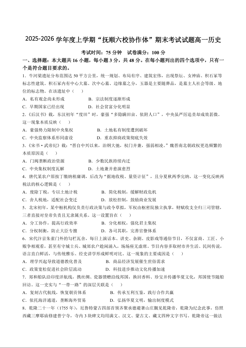 高一历史+答案--辽宁省抚顺市六校协作体2025-2026学年高一上学期期末联考