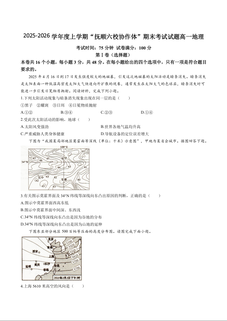 高一地理+答案--辽宁省抚顺市六校协作体2025-2026学年高一上学期期末联考
