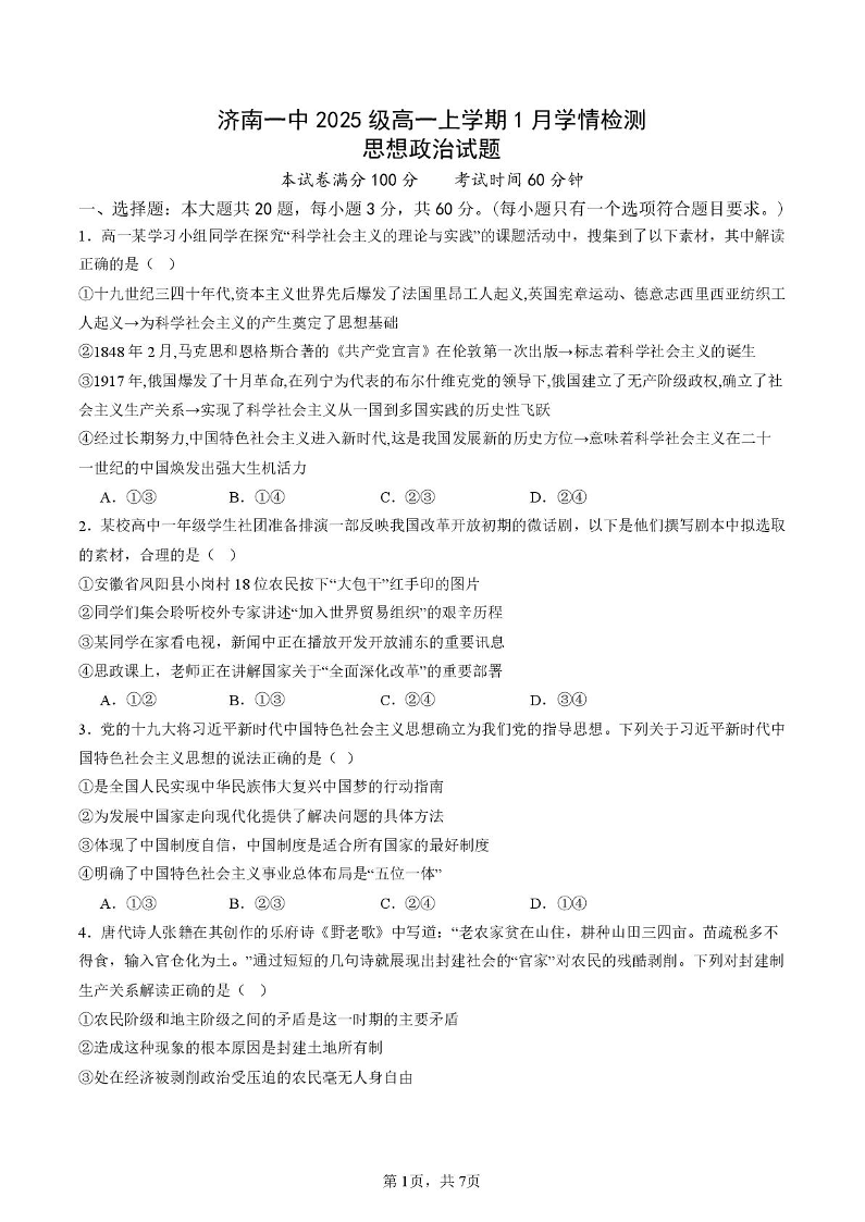 高一政治--山东省济南第一中学2025-2026学年高一上学期1月学情检测