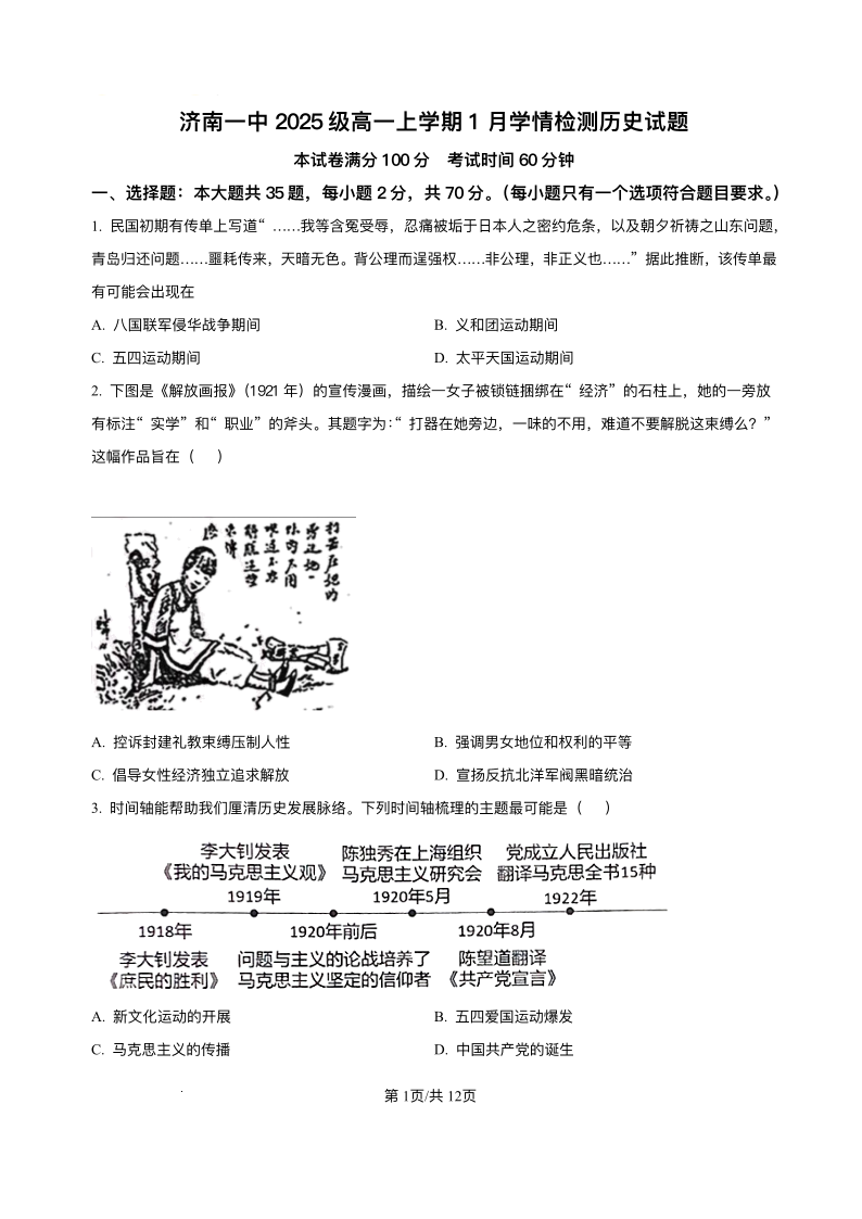 高一历史+答案--山东省济南第一中学2025-2026学年高一上学期1月学情检测