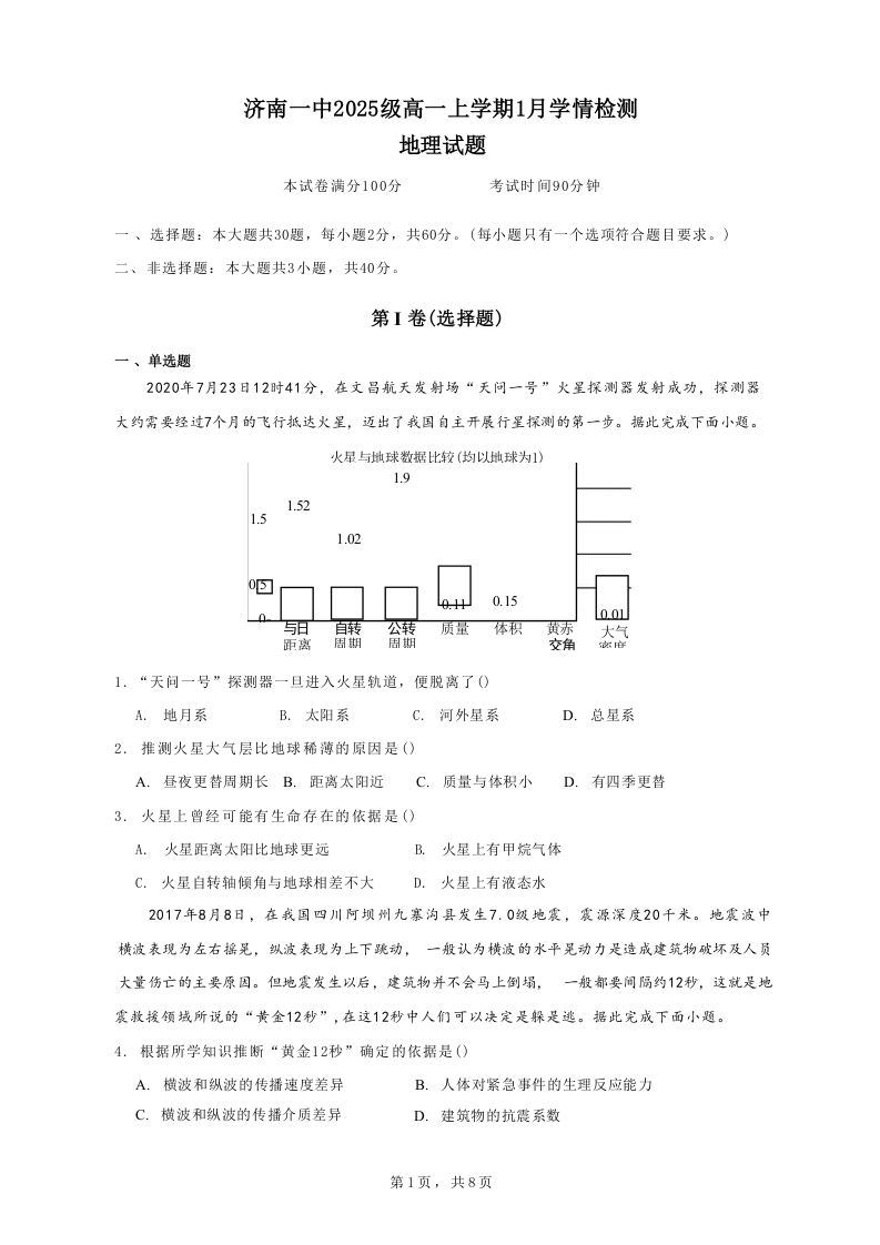 高一地理--山东省济南第一中学2025-2026学年高一上学期1月学情检测