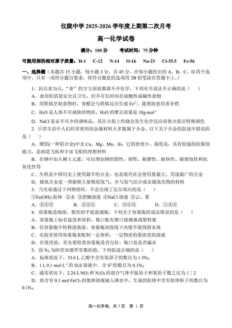 高一化学--四川省南充市仪陇中学2025-2026学年高一上学期12月月考