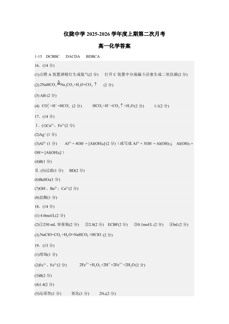 高一化学答案--四川省南充市仪陇中学2025-2026学年高一上学期12月月考
