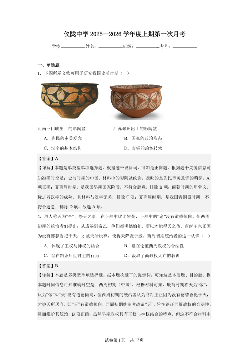 高一历史答案--四川省南充市仪陇中学2025-2026学年高一上学期12月月考
