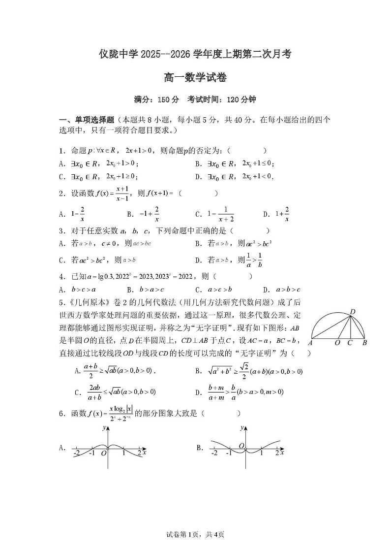 高一数学--四川省南充市仪陇中学2025-2026学年高一上学期12月月考