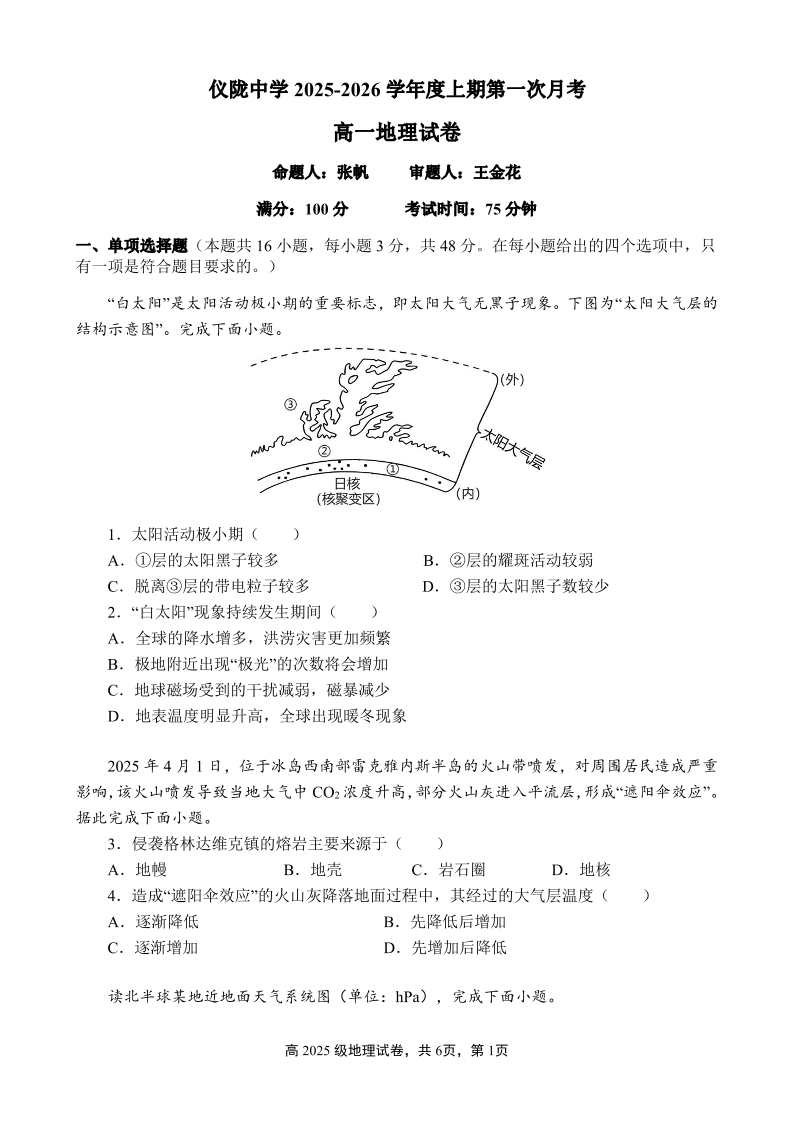 高一地理--四川省南充市仪陇中学2025-2026学年高一上学期12月月考