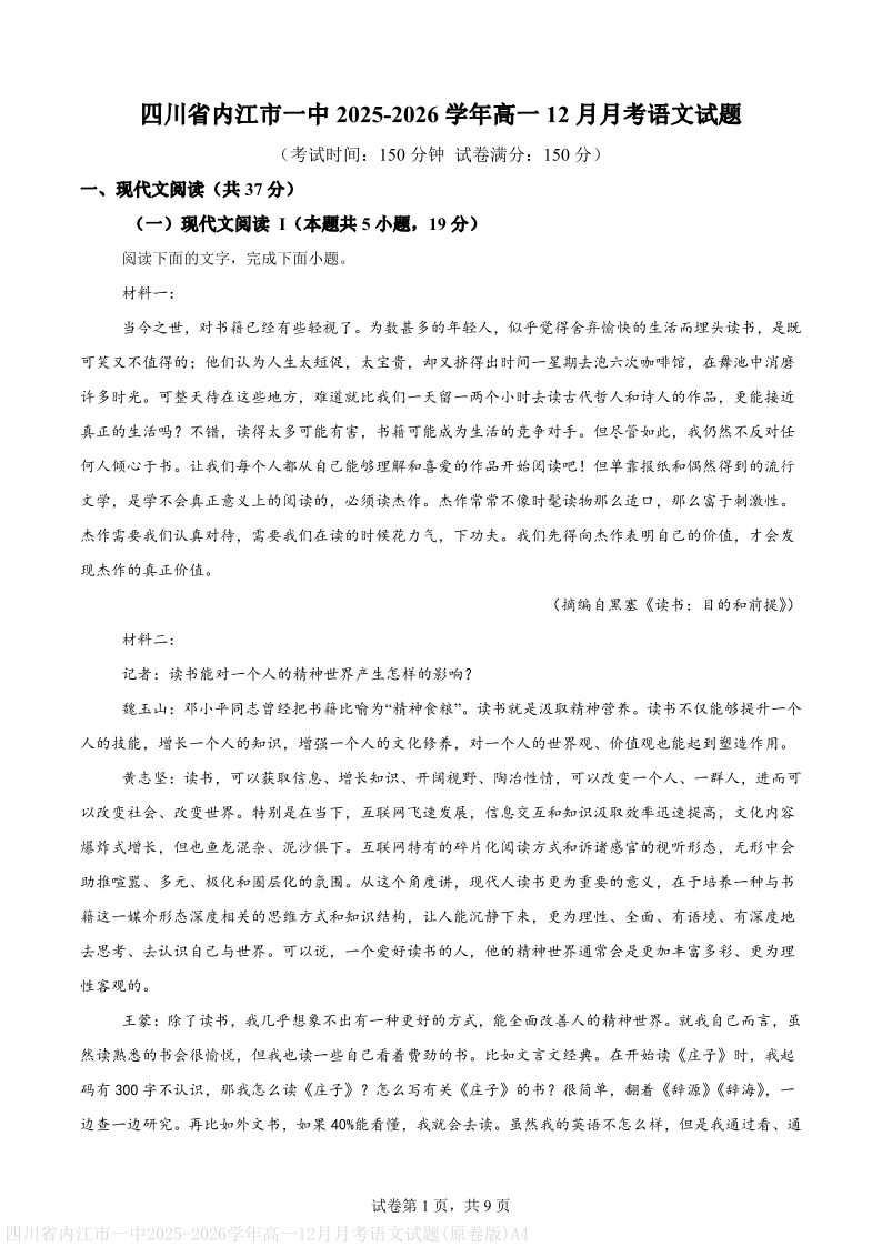 高一语文(原卷版)--四川省内江市第一中学2025-2026学年高一上学期12月月考