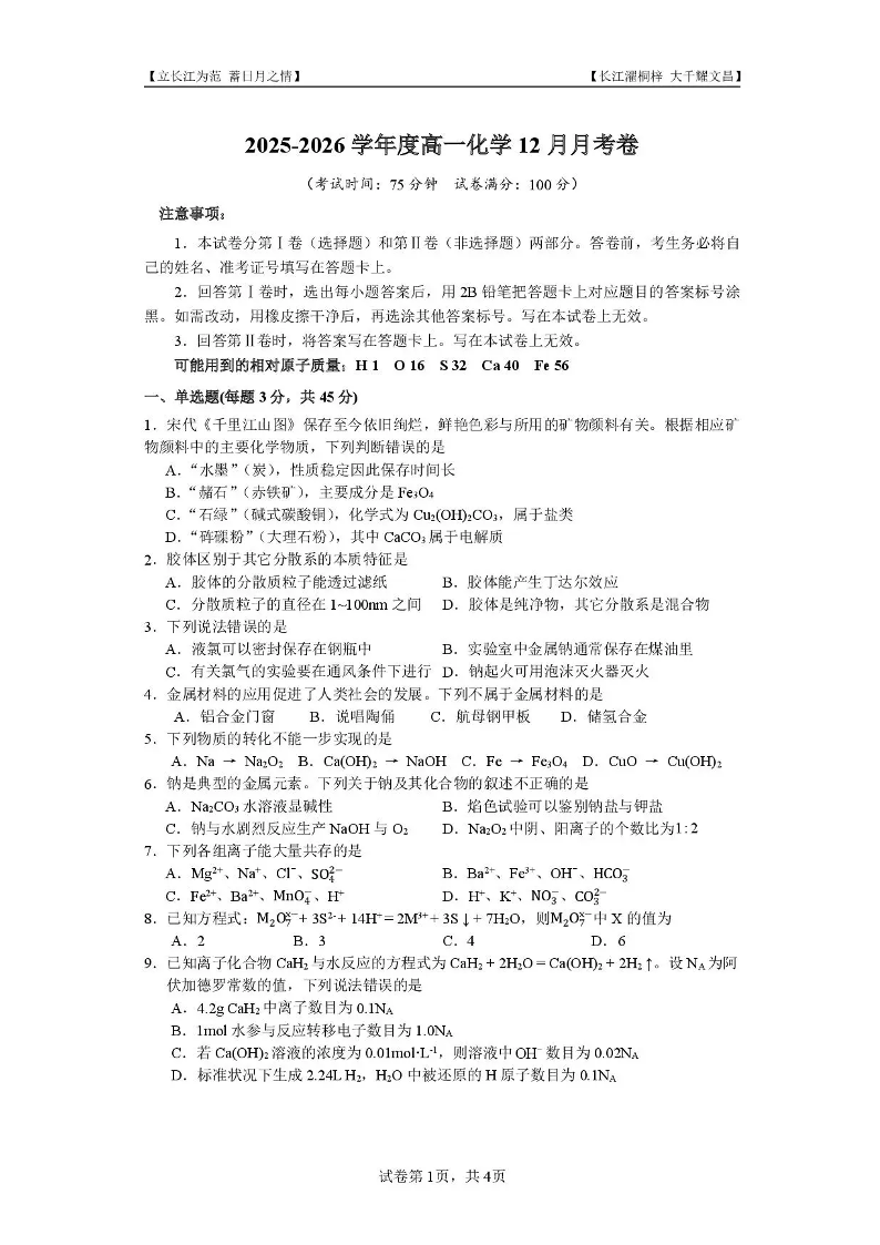 高一化学+答案--四川省内江市第一中学2025-2026学年高一上学期12月月考
