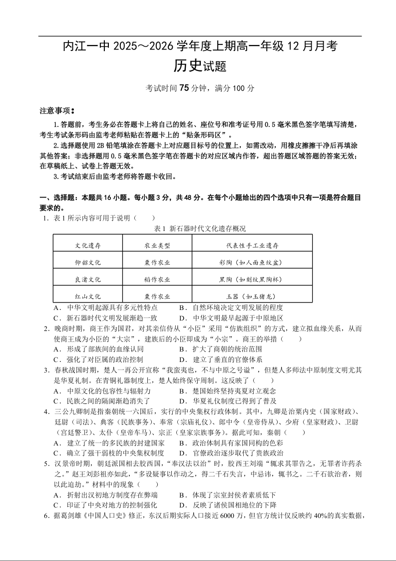 高一历史+答案--四川省内江市第一中学2025-2026学年高一上学期12月月考