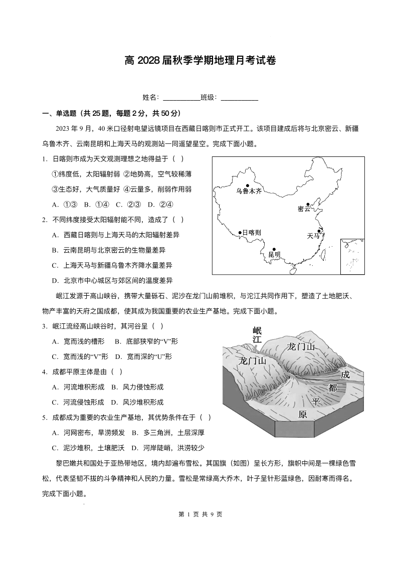 高一地理+答案--四川省内江市第一中学2025-2026学年高一上学期12月月考