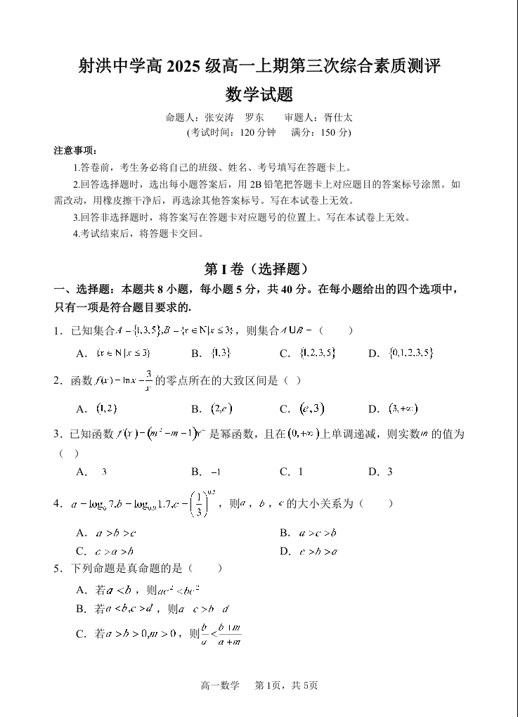 高一数学+答案--四川省遂宁市射洪中学2025-2026学年高一上学期1月月考