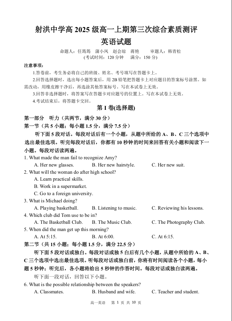 高一英语--四川省遂宁市射洪中学2025-2026学年高一上学期1月月考