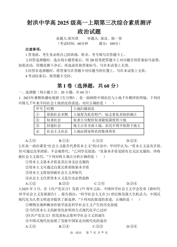 高一政治--四川省遂宁市射洪中学2025-2026学年高一上学期1月月考