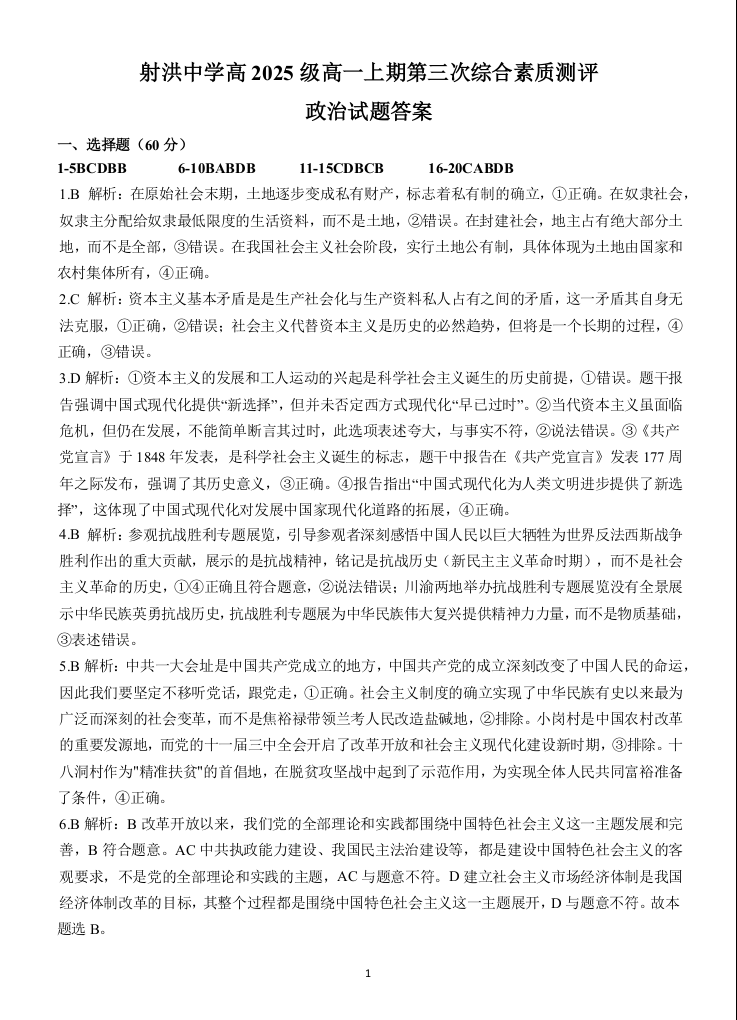 高一政治答案--四川省遂宁市射洪中学2025-2026学年高一上学期1月月考