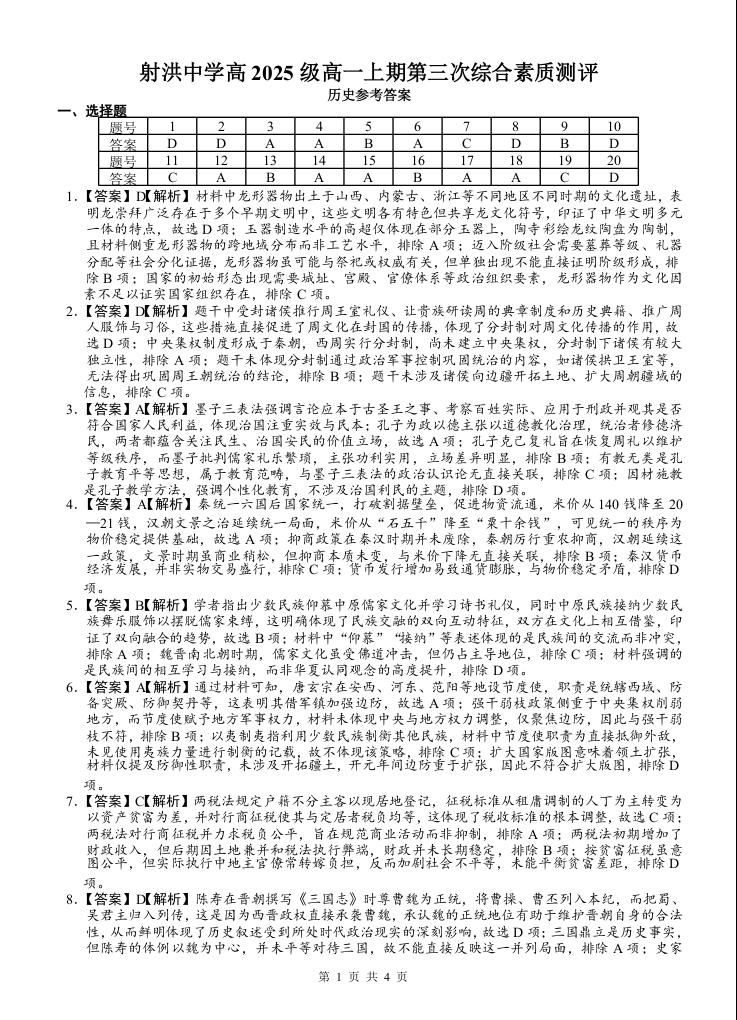 高一历史答案--四川省遂宁市射洪中学2025-2026学年高一上学期1月月考