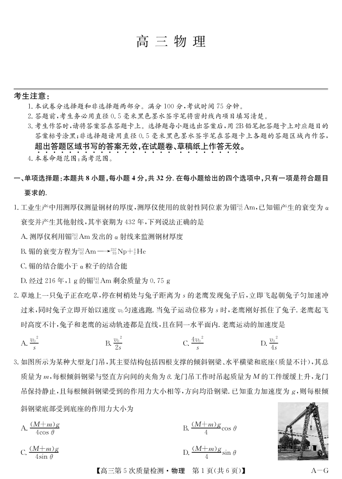 高三物理--安徽省九师联盟2026届高三(1月)第五次质量检测