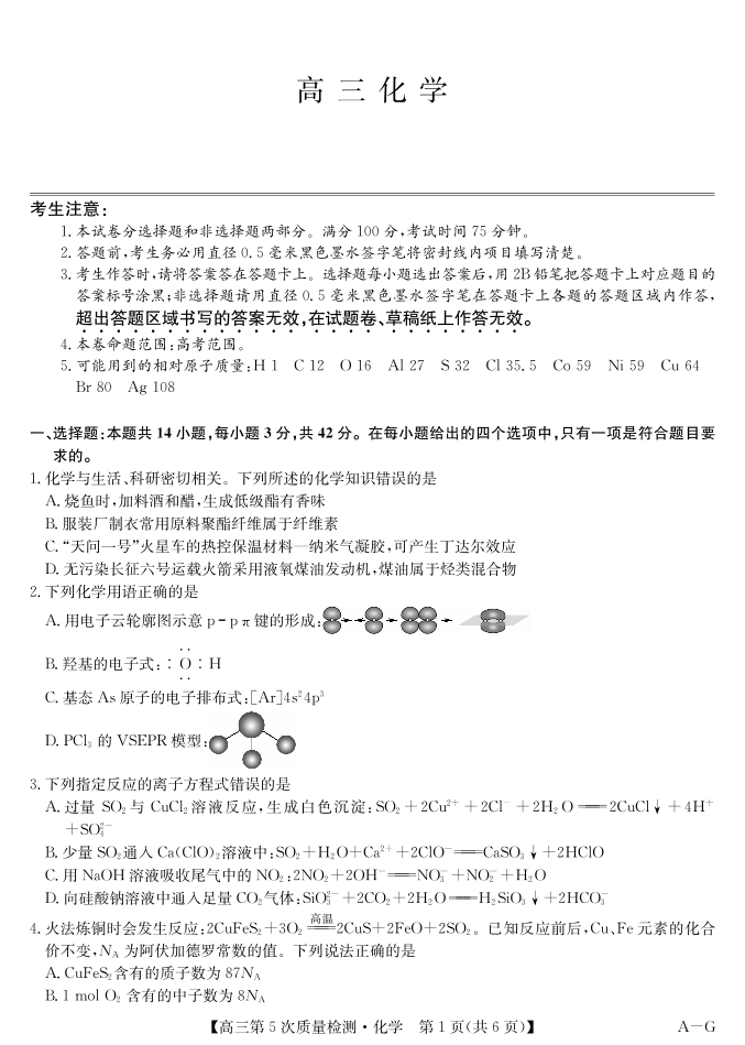 高三化学--安徽省九师联盟2026届高三(1月)第五次质量检测