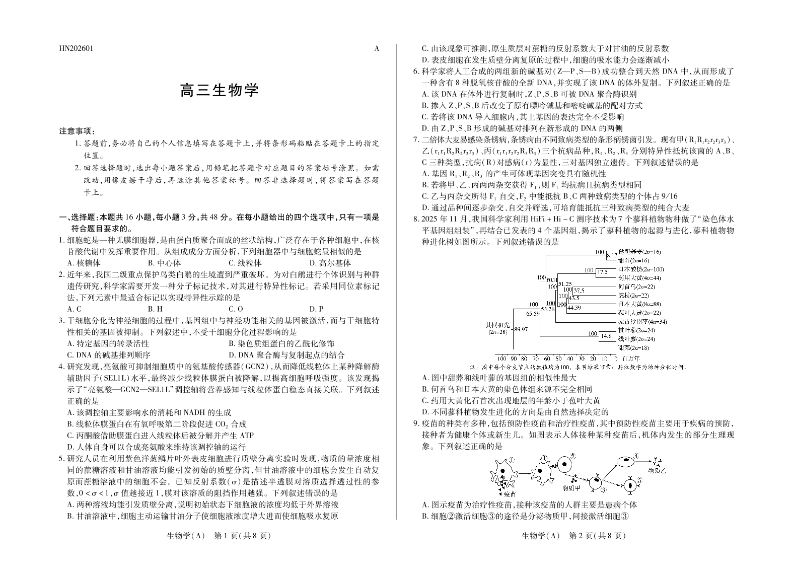 高三生物A--河南省多校小高考2026届高三上学期素质评价(三)