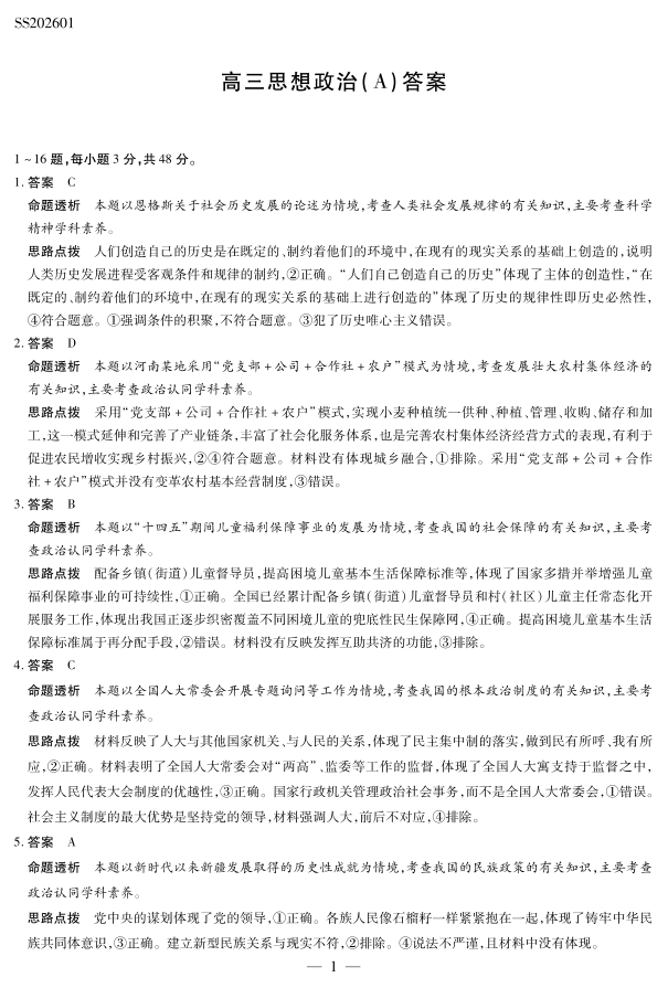 高三政治答案--陕西山西宁夏青海2026届高三学期1月四省联考