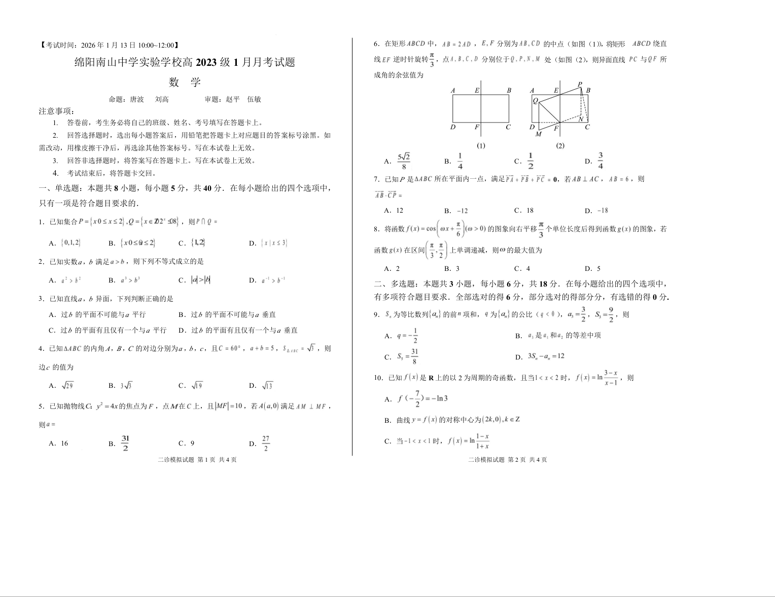 高三数学--四川省绵阳市南山中学实验学校2026届高三上学期1月月考