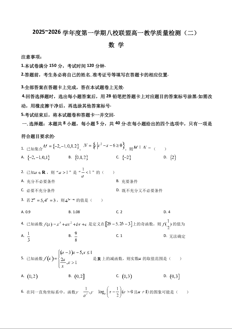 高一数学+答案--广东省八校联盟2025-2026学年高一上学期教学质量检测(二)