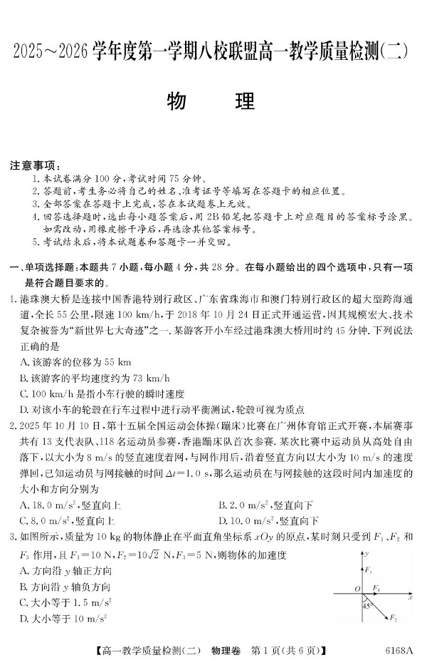高一物理+答案--广东省八校联盟2025-2026学年高一上学期教学质量检测(二)