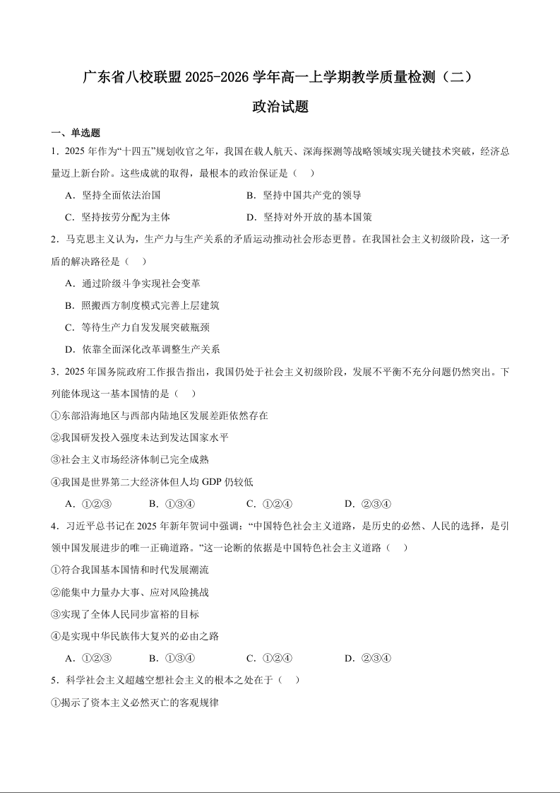 高一政治+答案--广东省八校联盟2025-2026学年高一上学期教学质量检测(二)
