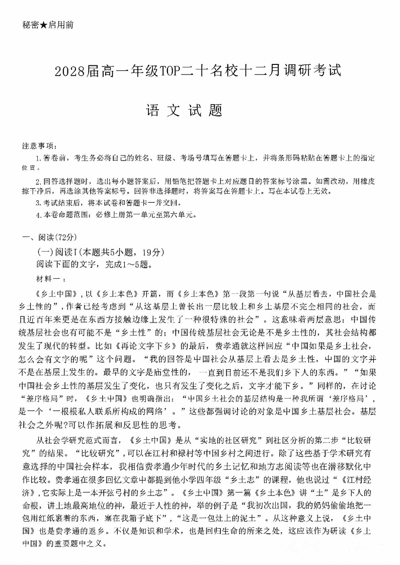 高一语文+答案--河南省TOP二十名校2025-2026学年高一上学期12月调研考试