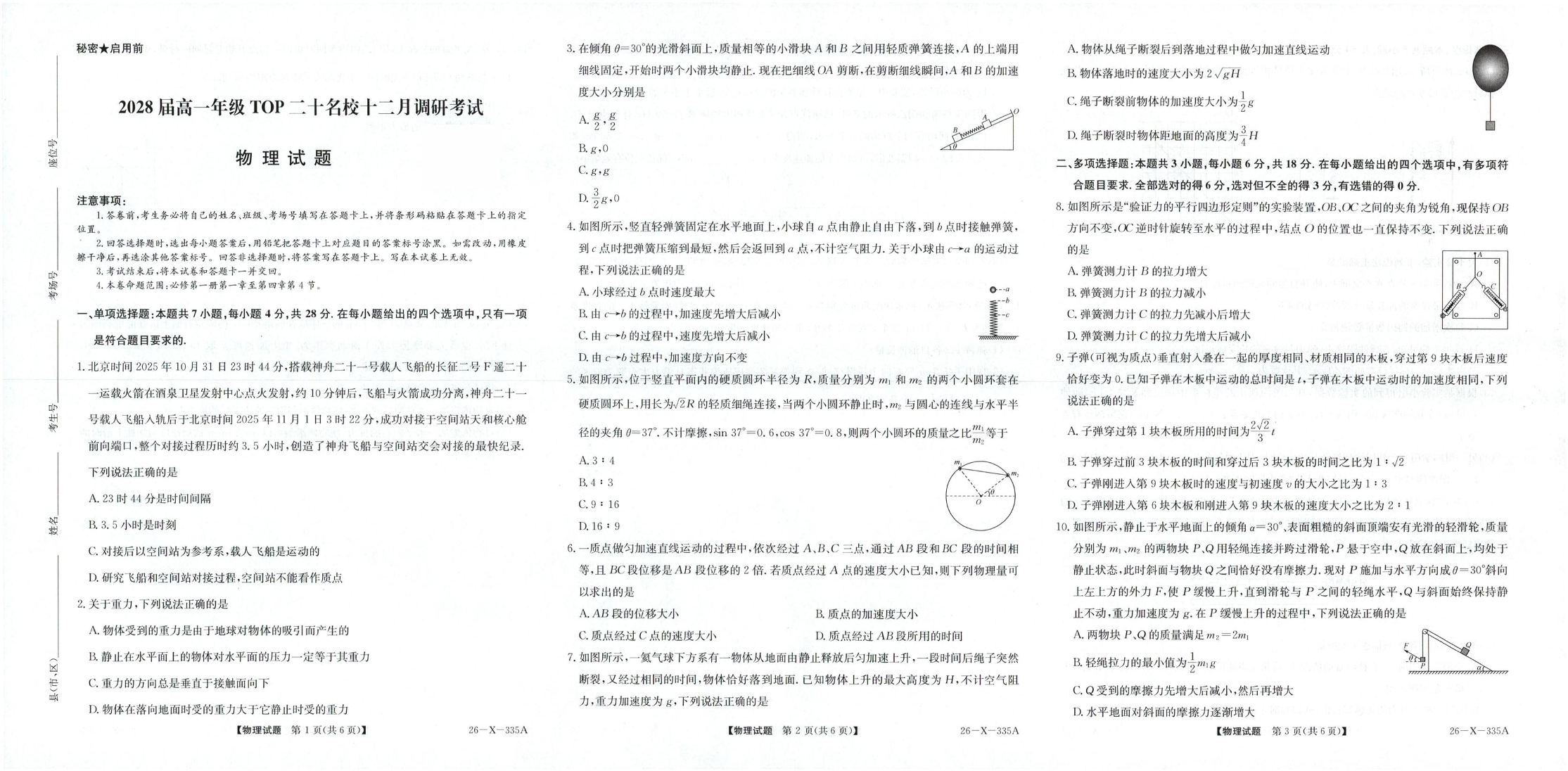 高一物理+答案--河南省TOP二十名校2025-2026学年高一上学期12月调研考试