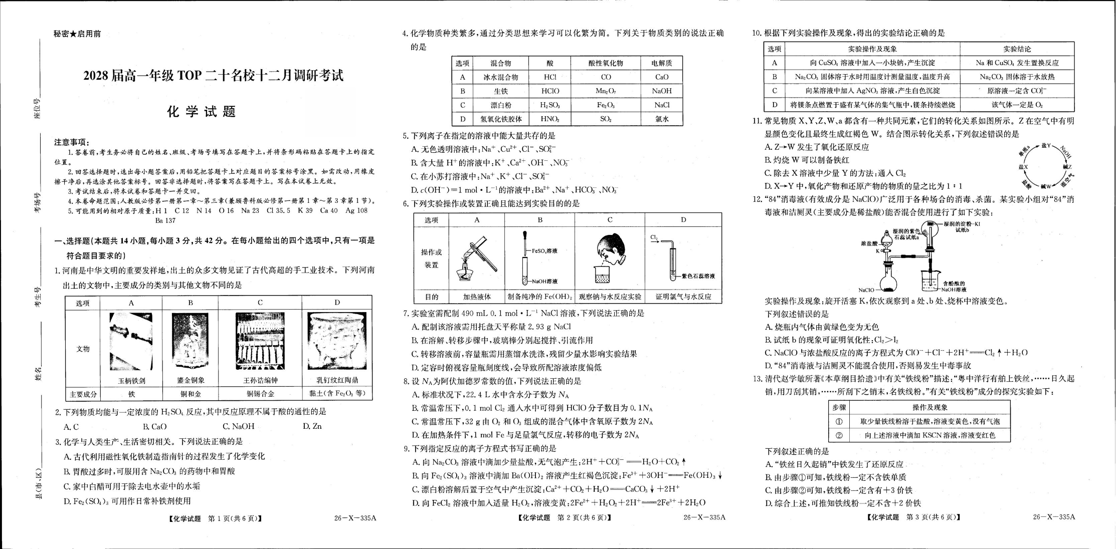 高一化学+答案--河南省TOP二十名校2025-2026学年高一上学期12月调研考试