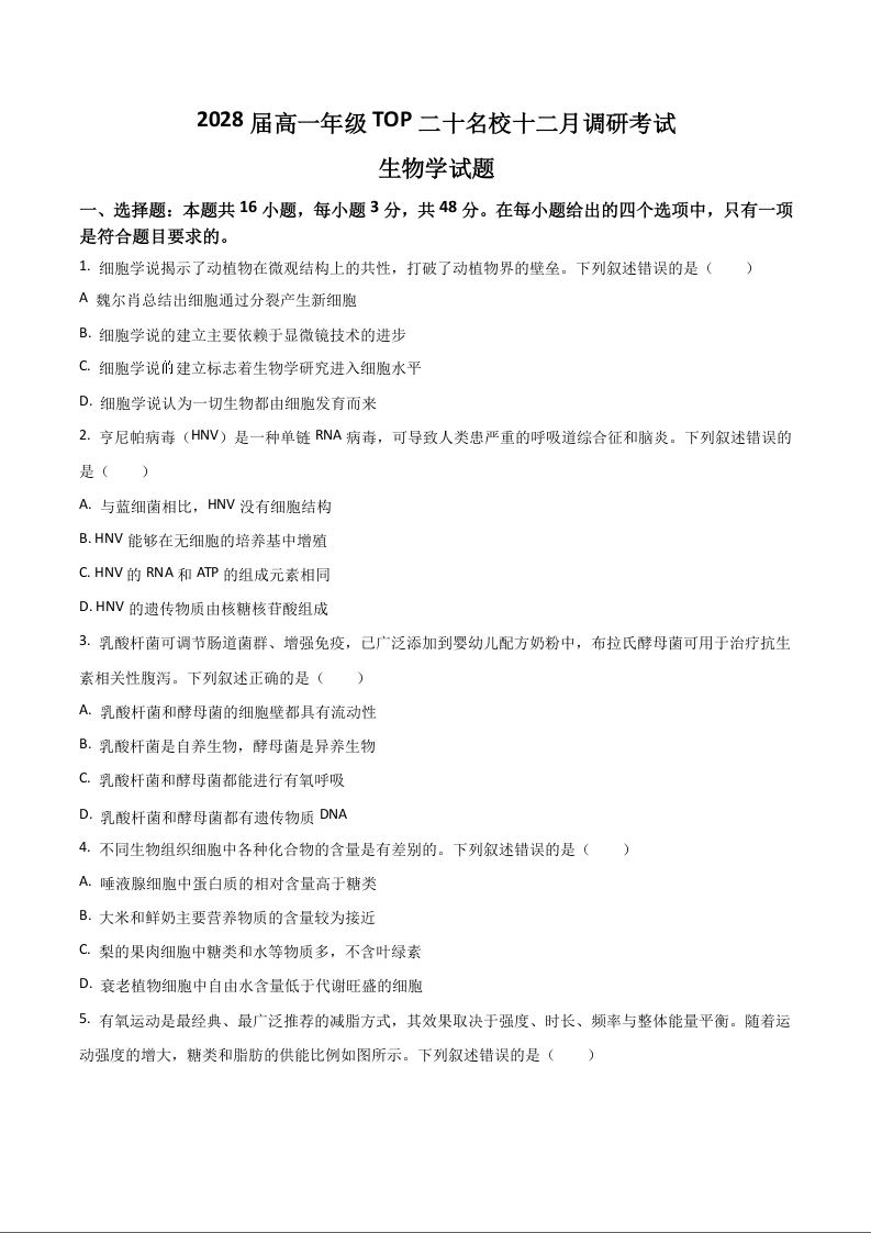 高一生物+答案--河南省TOP二十名校2025-2026学年高一上学期12月调研考试