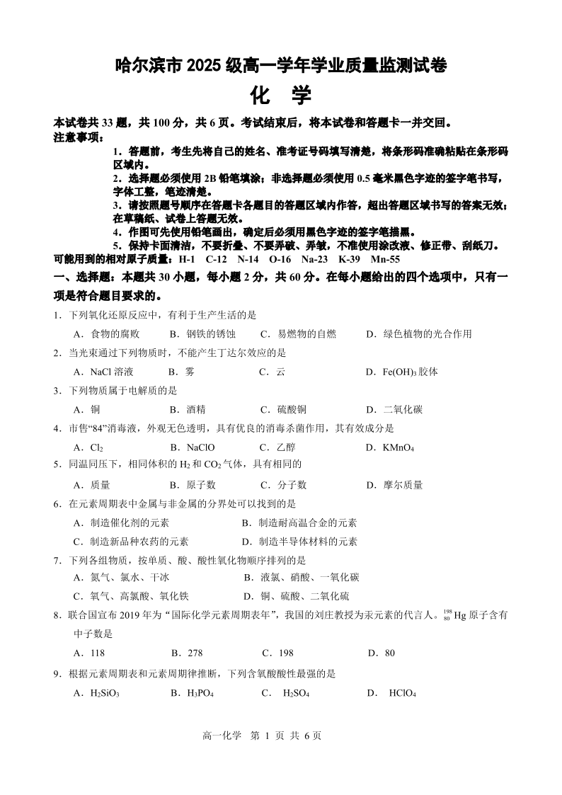 高一化学--黑龙江省哈尔滨市2025-2026学年高一上学期期末学业质量检测