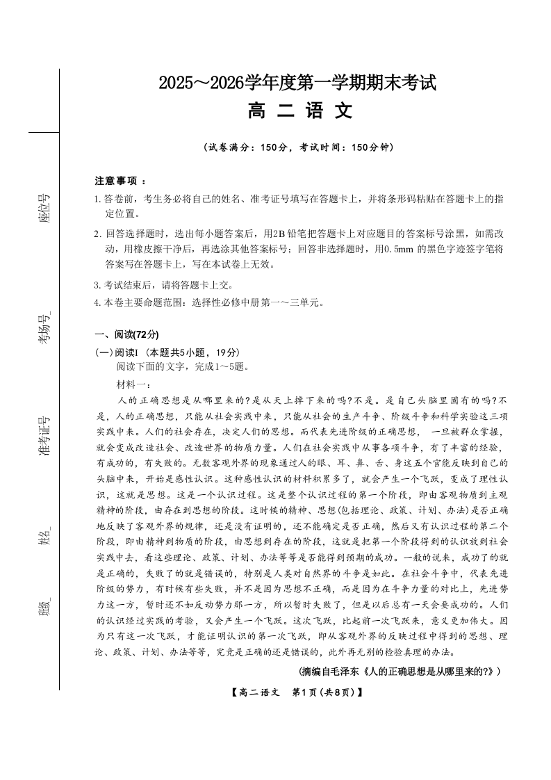 高二语文+答案--甘肃省部分学校2025-2026学年高二上学期1月期末考试