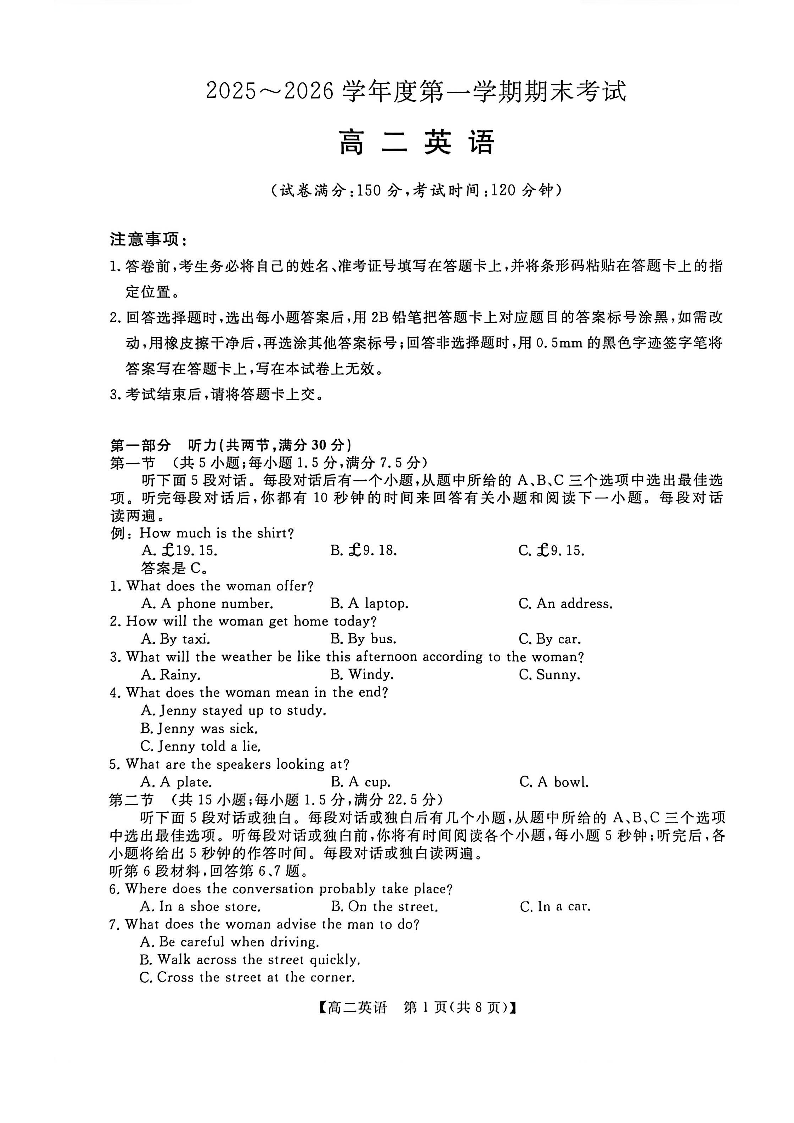 高二英语--甘肃省部分学校2025-2026学年高二上学期1月期末考试