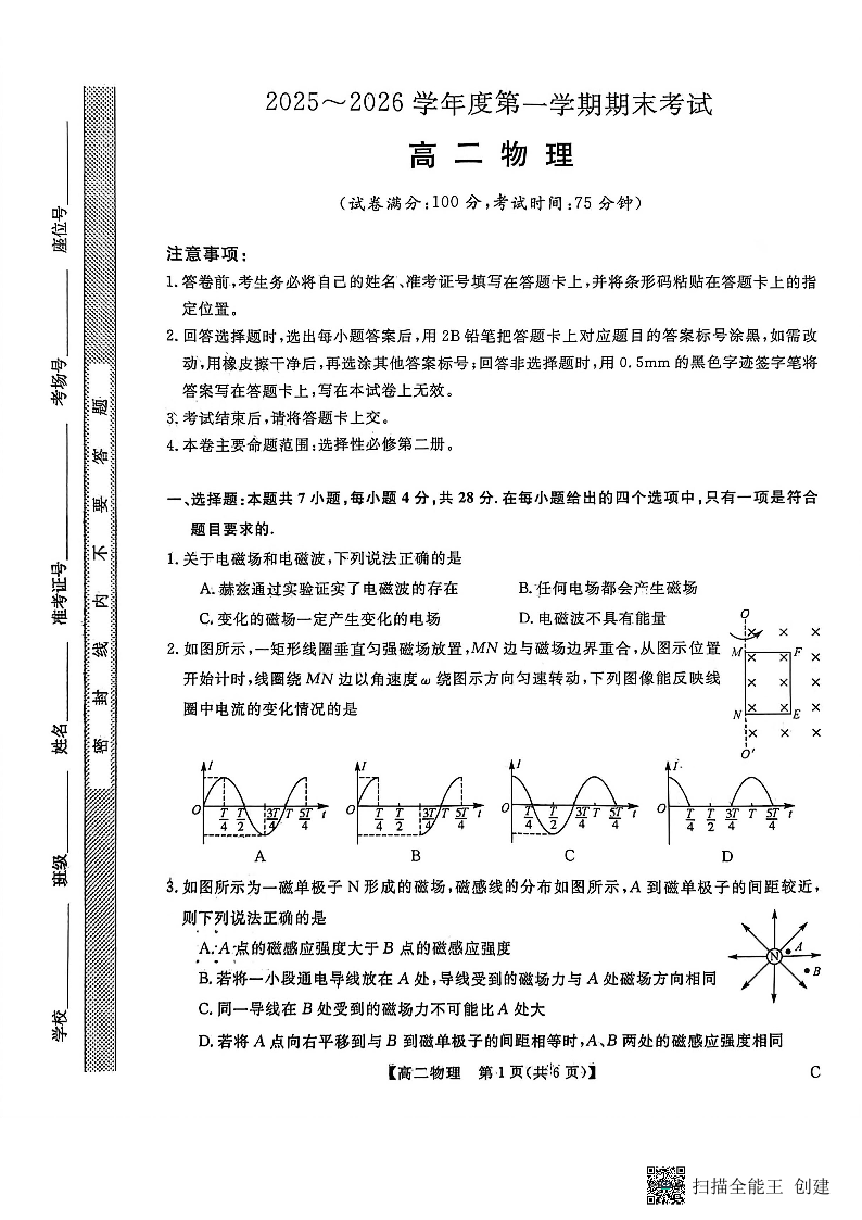高二物理--甘肃省部分学校2025-2026学年高二上学期1月期末考试
