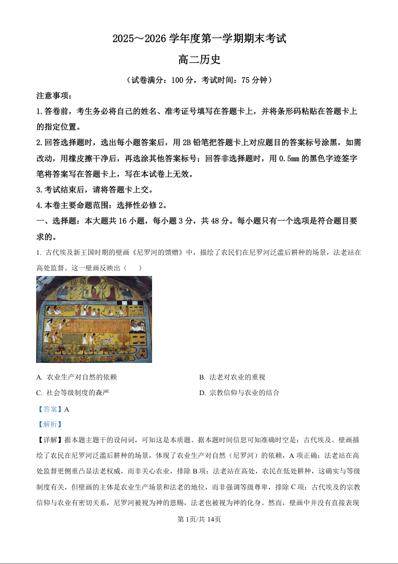 高二历史(精品解析版)--甘肃省部分学校2025-2026学年高二上学期1月期末考试