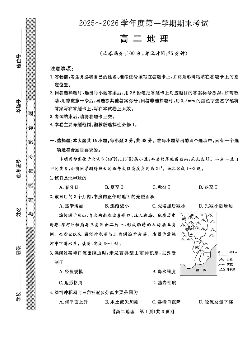 高二地理--甘肃省部分学校2025-2026学年高二上学期1月期末考试