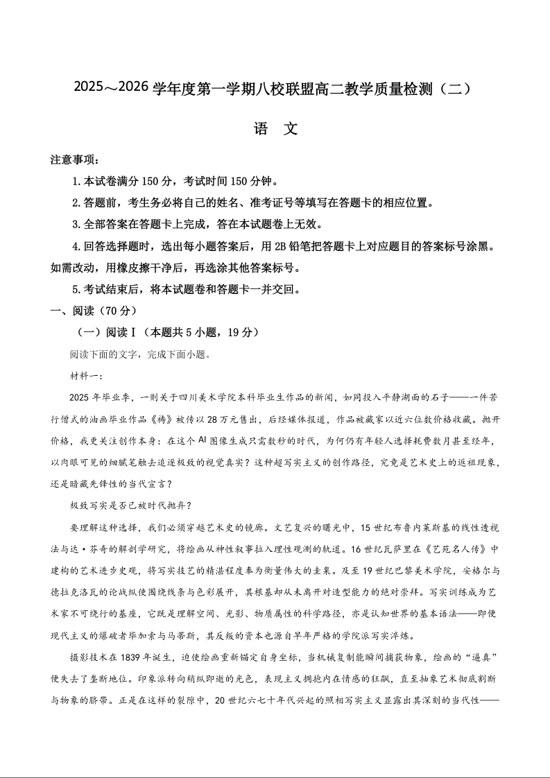 高二语文+答案--广东省八校联盟2025-2026学年高二上学期教学质量检测(二)