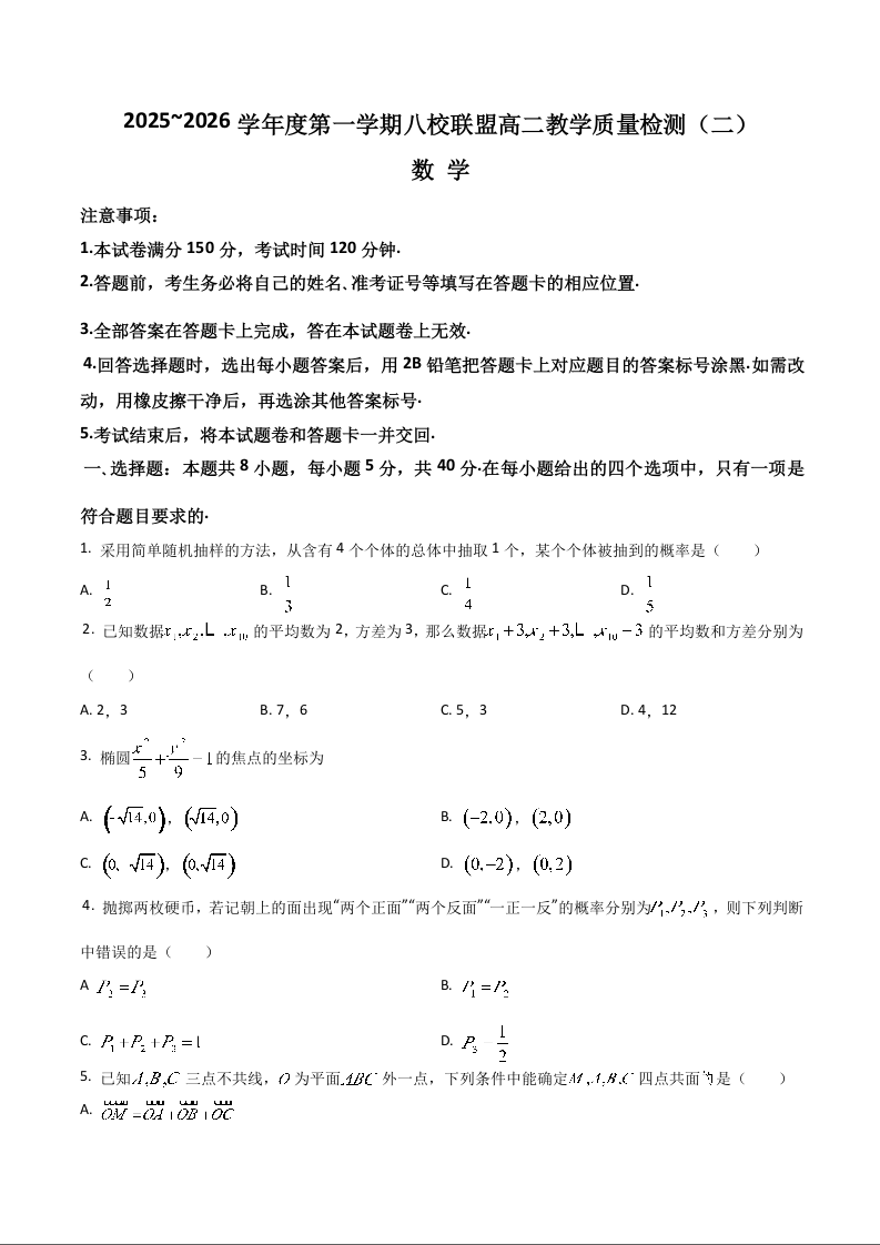 高二数学+答案--广东省八校联盟2025-2026学年高二上学期教学质量检测(二)