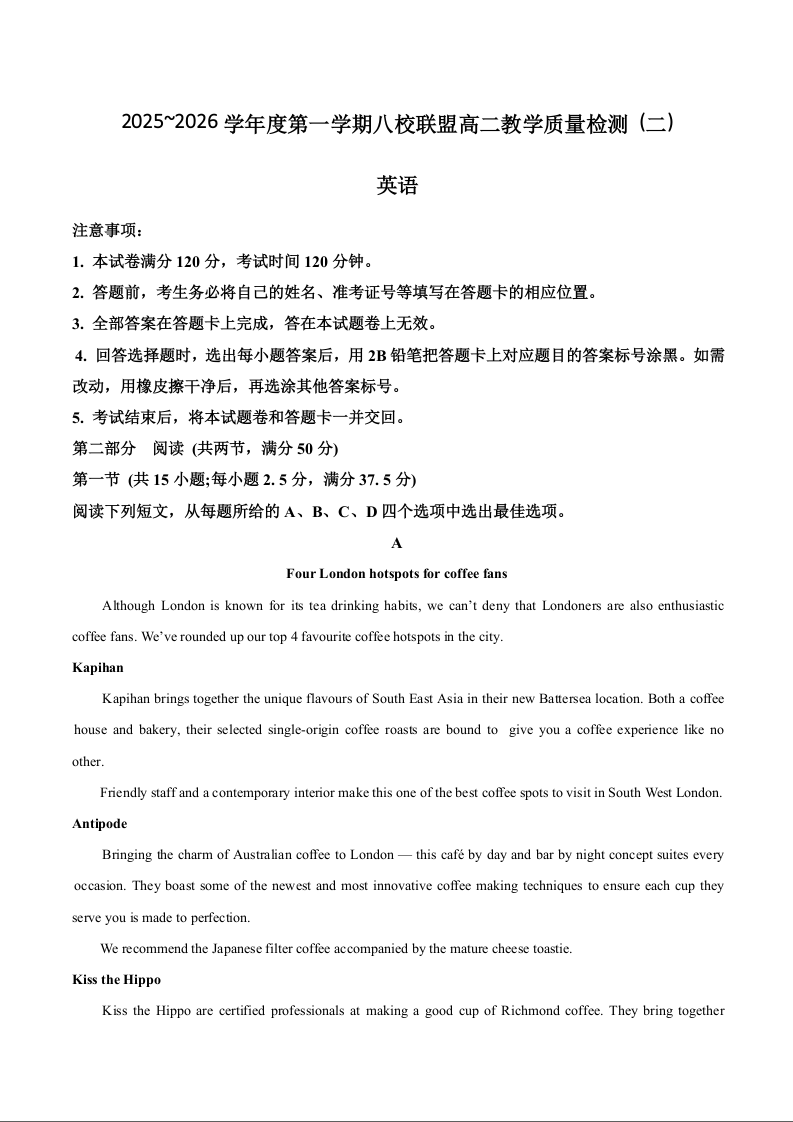 高二英语+答案--广东省八校联盟2025-2026学年高二上学期教学质量检测(二)
