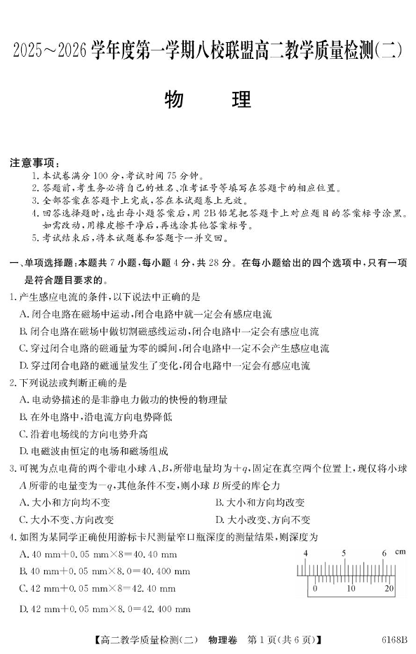 高二物理+答案--广东省八校联盟2025-2026学年高二上学期教学质量检测(二)
