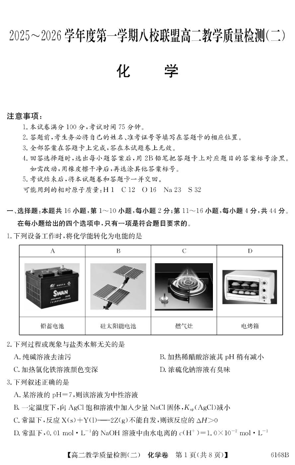 高二化学+答案--广东省八校联盟2025-2026学年高二上学期教学质量检测(二)