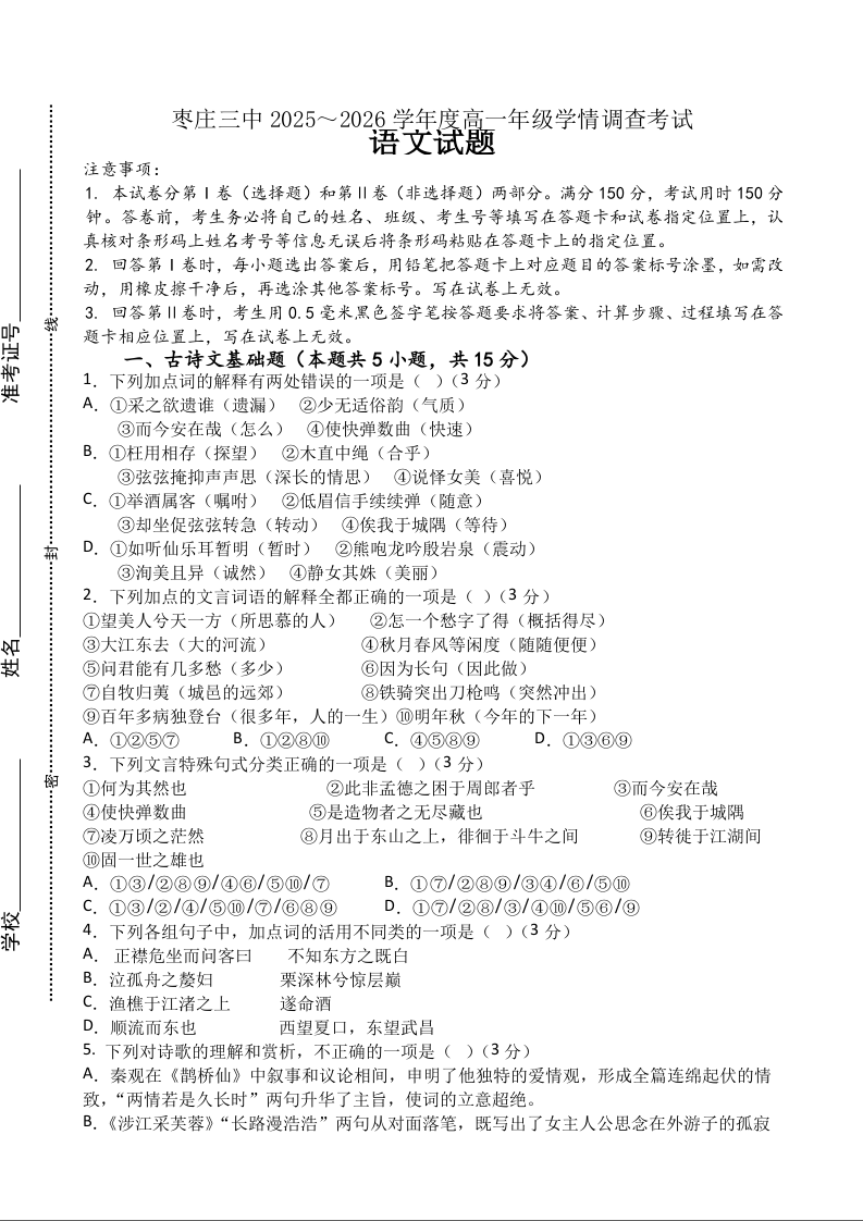 高一语文--山东省枣庄市第三中学2025-2026学年高一上学期1月月考