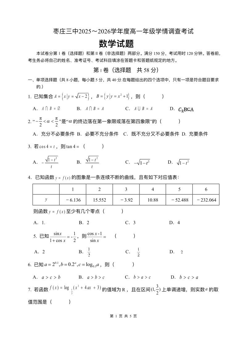 高一数学+答案--山东省枣庄市第三中学2025-2026学年高一上学期1月月考