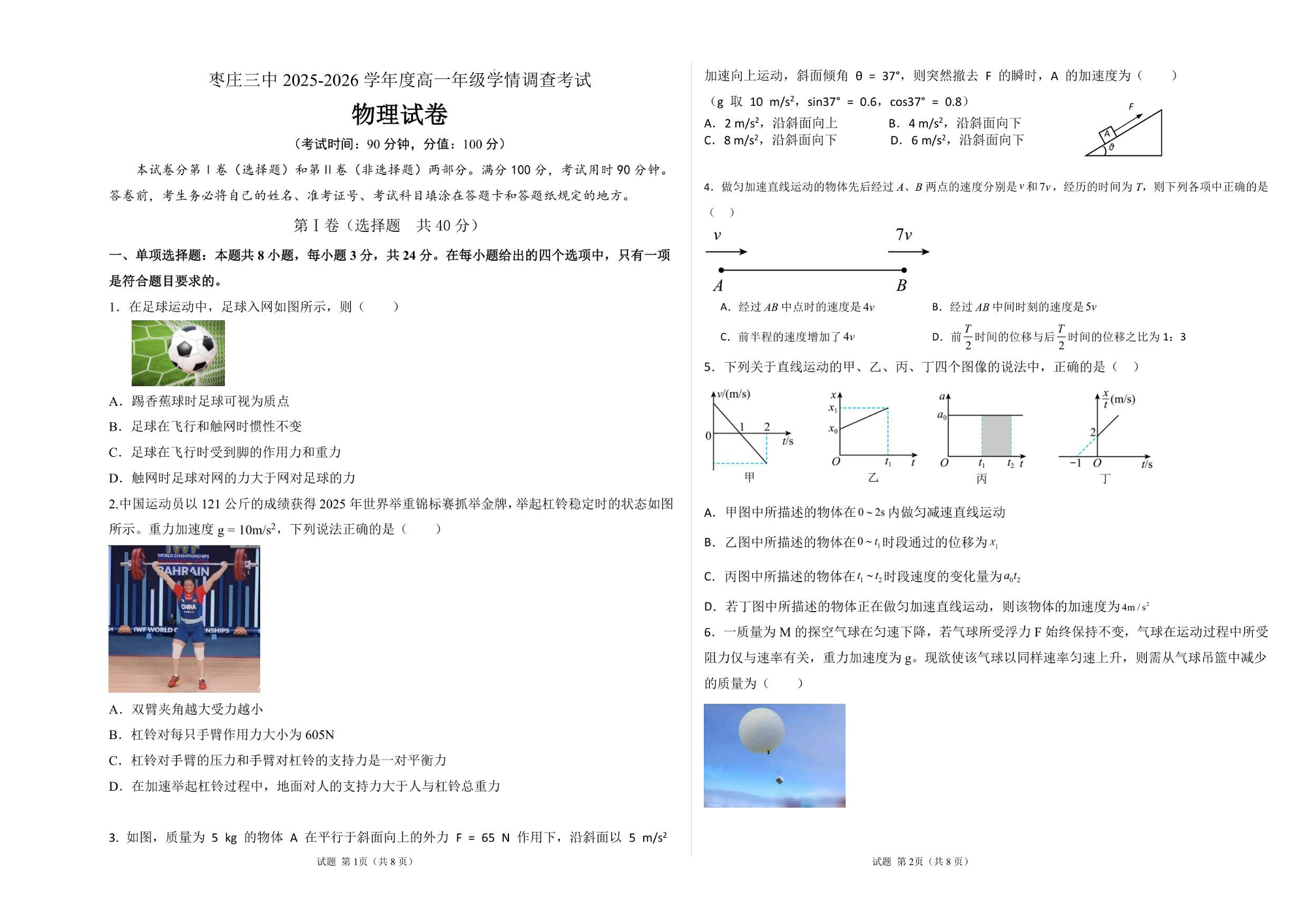 高一物理--山东省枣庄市第三中学2025-2026学年高一上学期1月月考