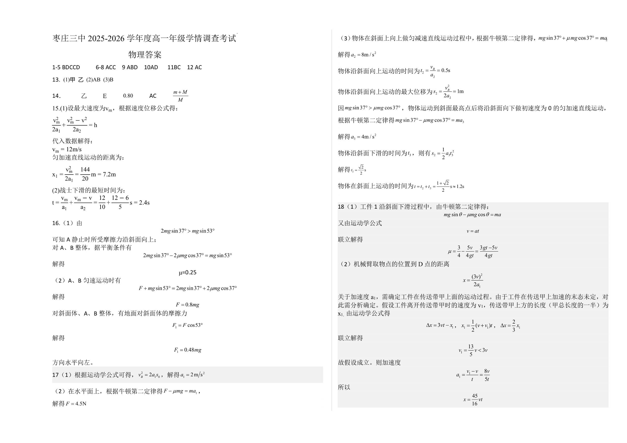 高一物理答案--山东省枣庄市第三中学2025-2026学年高一上学期1月月考