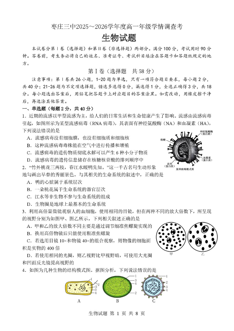 高一生物--山东省枣庄市第三中学2025-2026学年高一上学期1月月考