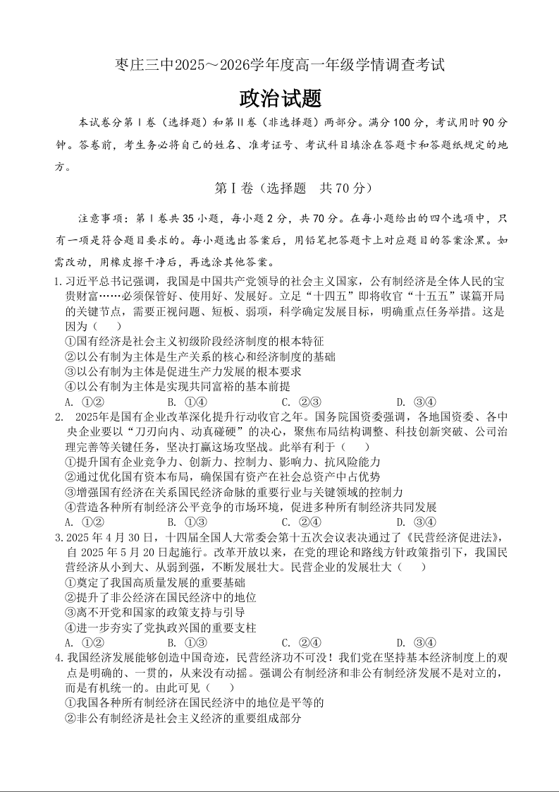 高一政治--山东省枣庄市第三中学2025-2026学年高一上学期1月月考
