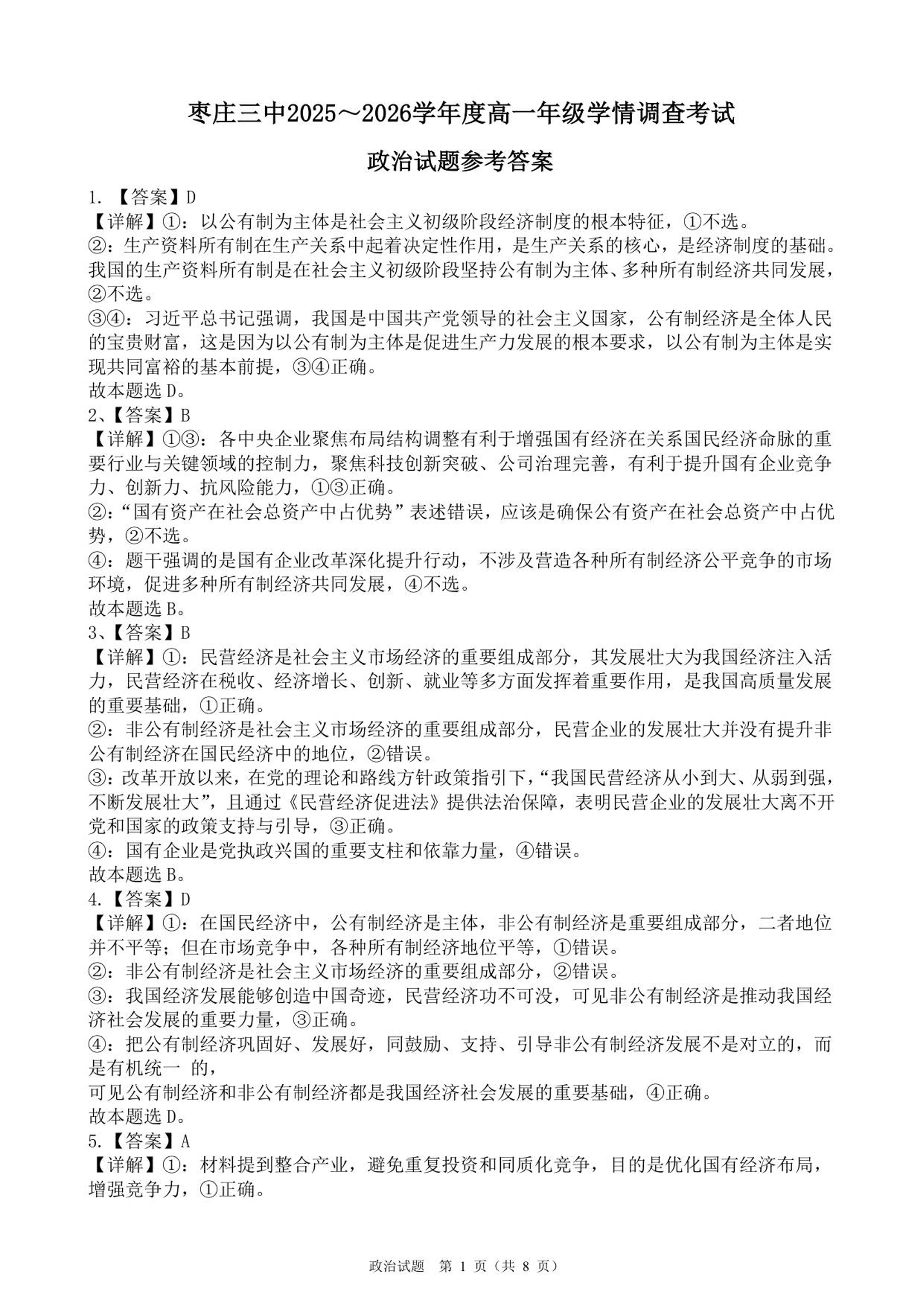 高一政治答案--山东省枣庄市第三中学2025-2026学年高一上学期1月月考