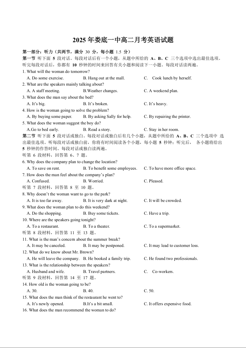 高二英语+答案--湖南省娄底市第一中学2025-2026学年高二上学期1月月考